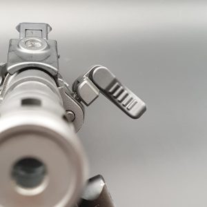 When relaxed, the adjustable cocking slide can be folded towards the housing like the cocking slide of the AUG A3 to minimize the risk of breaking off in the event of a hard impact. However, as soon as a shooter pulls the cocking slide to repeat the weapon or to bring the bolt into the rear position, the handle can no longer be folded down. This function ensures a safer and faster repeating movement and a more reliable locking of the cocking slide in the housing. The second feature of the cocking slide is the adjustability of the handle angle. The cocking slide handle can be adjusted and fixed at any time by the shooter at a total angle of more than 100° by loosening the screw connection. The serrated washer prevents the handle from slipping.